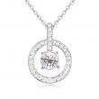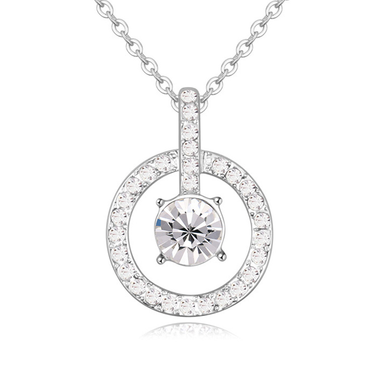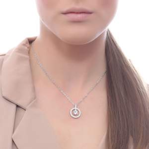 Dije con cadena en baño de oro blanco de 18 quilates, diseño de aro con cristal blanco corte brillante e incrustaciones de cristales en color blanco. Fabricado en una estructura de aleación de platino con rodio sin níquel.