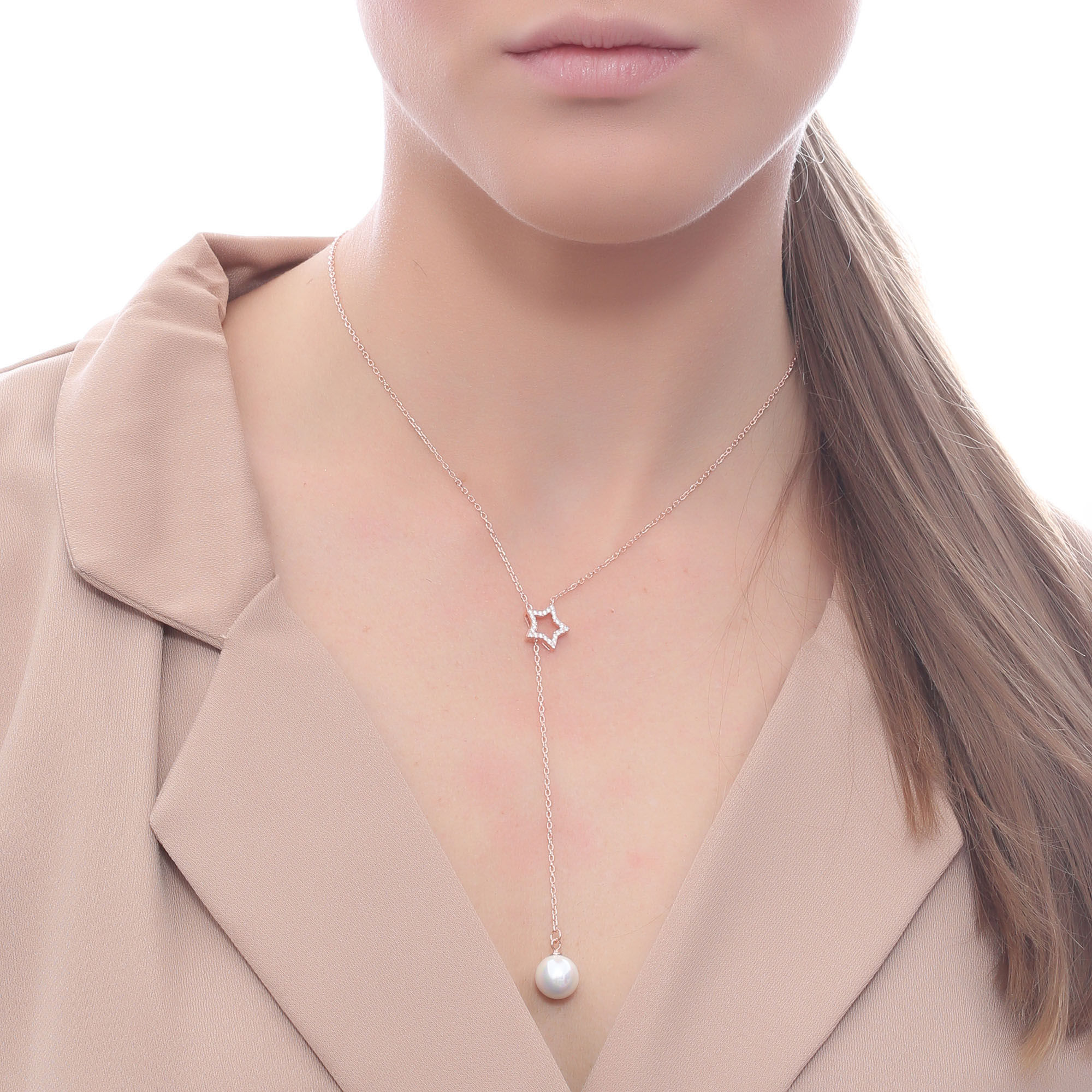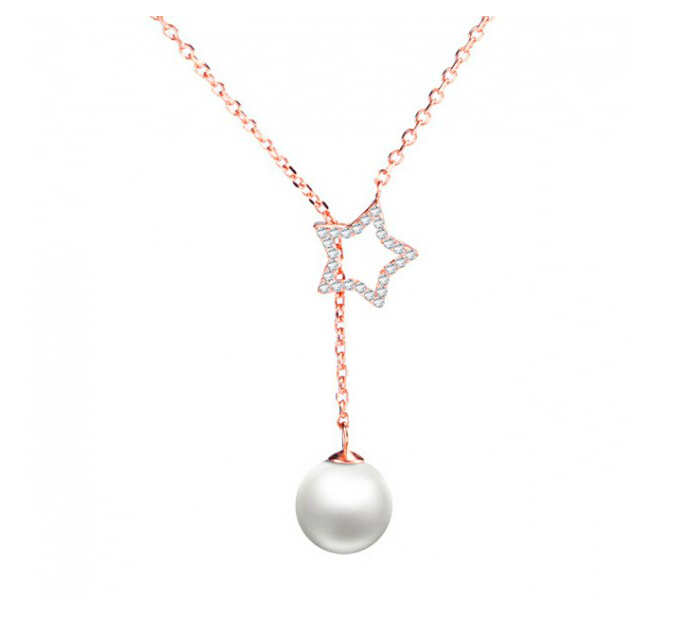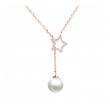 Collar en baño de oro rosa de 18 quilates, detalle de estrella, perla blanca e incrustaciones de cristales en color blanco. Fabricado en una estructura de aleación de platino con rodio sin níquel.