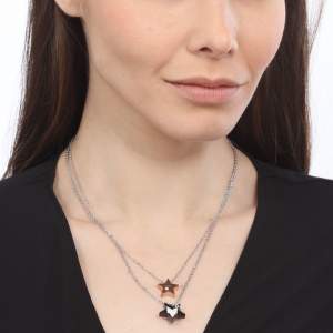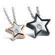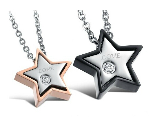 Lindo juego de dijes de acero inoxidable en baño rosa y negro con diseño de estrellas y con grabado de la palabra "love" e incrustaciones de cristales blancos.