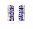 Preciosos aretes en baño de oro amarillo de 18 quilates, elegante diseño con cristales corte princesa de color morado e incrustaciones de cristales blancos. Fabricado en una estructura de aleación de platino con rodio sin níquel.