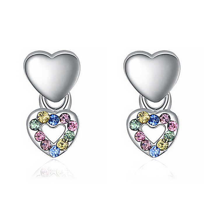 Aretes en baño de oro blanco de 18 quilates, fino diseño de corazones con incrustaciones de cristales de colores. Fabricado en una estructura de aleación de platino con rodio sin níquel.