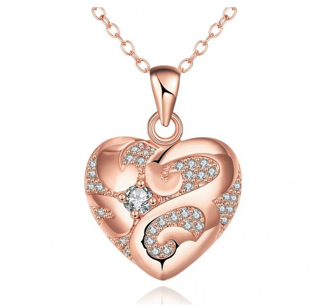 Dije con cadena en baño de oro rosa de 18 quilates, diseño de corazón con detalles en relieve e incrustaciones de cristales en color blanco. Fabricado en una estructura de aleación de platino con rodio sin níquel.
