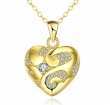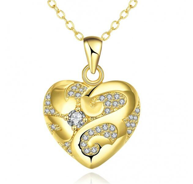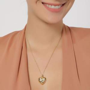 Dije con cadena en baño de oro amarillo de 18 quilates, diseño de corazón con relieve e incrustaciones de cristales en color blanco. Fabricado en una estructura de aleación de platino con rodio sin níquel.