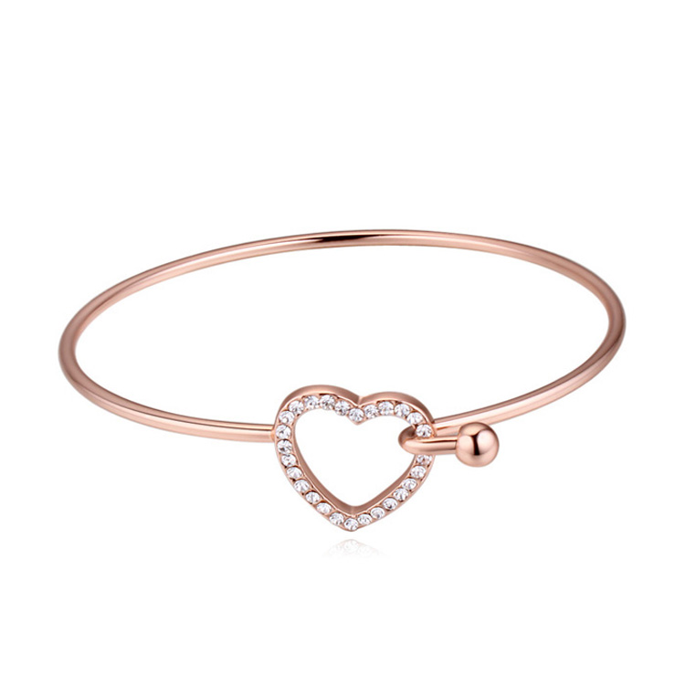 Hermoso brazalete en baño de oro rosa de 18 quilates, detalle de corazón con incrustaciones de cristales en color blanco. Fabricado en una estructura de aleación de platino con rodio sin níquel.