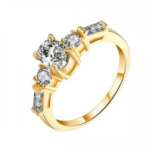 Anillo en baño de oro amarillo de 18 quilates, fino diseño con cristal blanco corte brillante e incrustaciones de cristales blancos. Fabricado en una estructura de aleación de platino con rodio sin níquel.