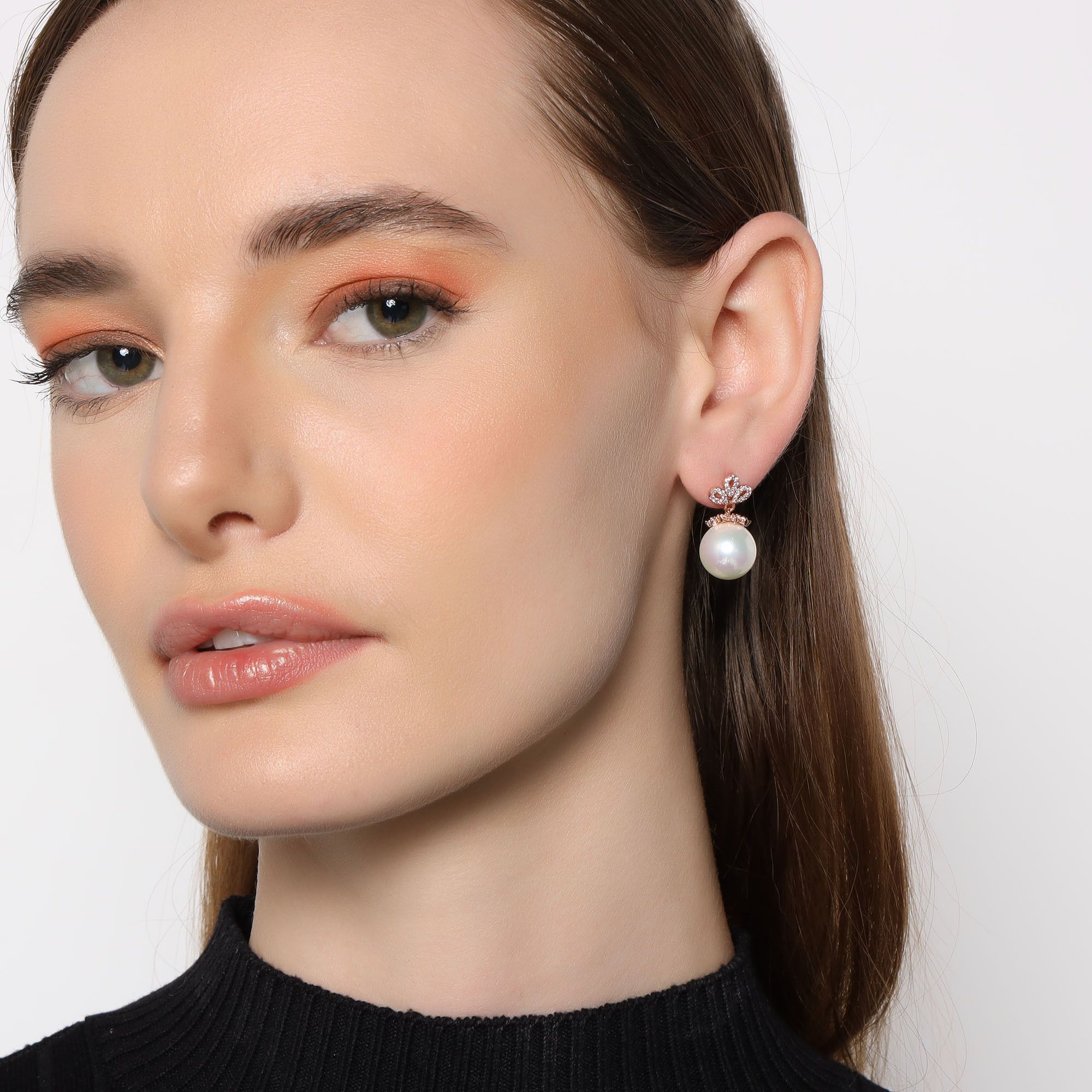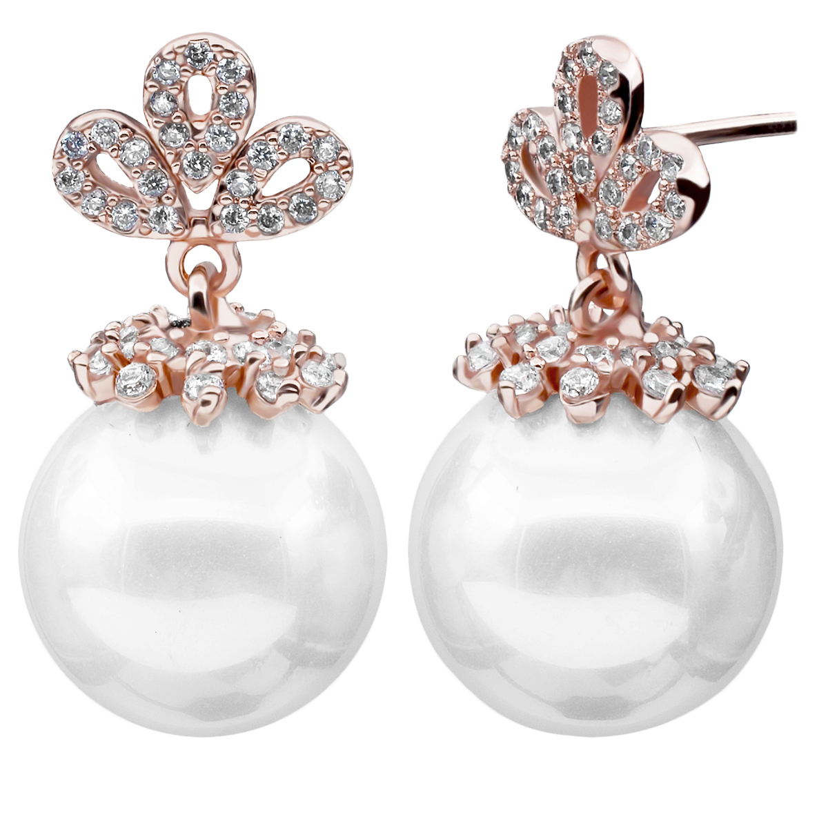 Aretes en baño de oro rosa de 18 quilates, fino diseño con incrustaciones de cristales en color blanco y perla blanca. Fabricado en una estructura de aleación de platino con rodio sin níquel.