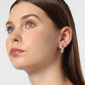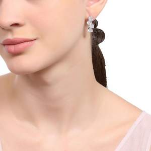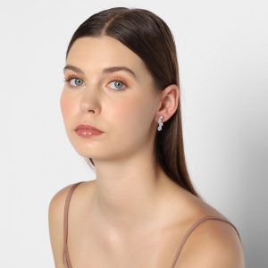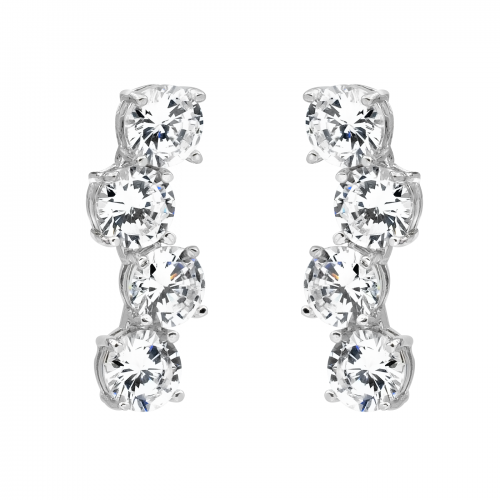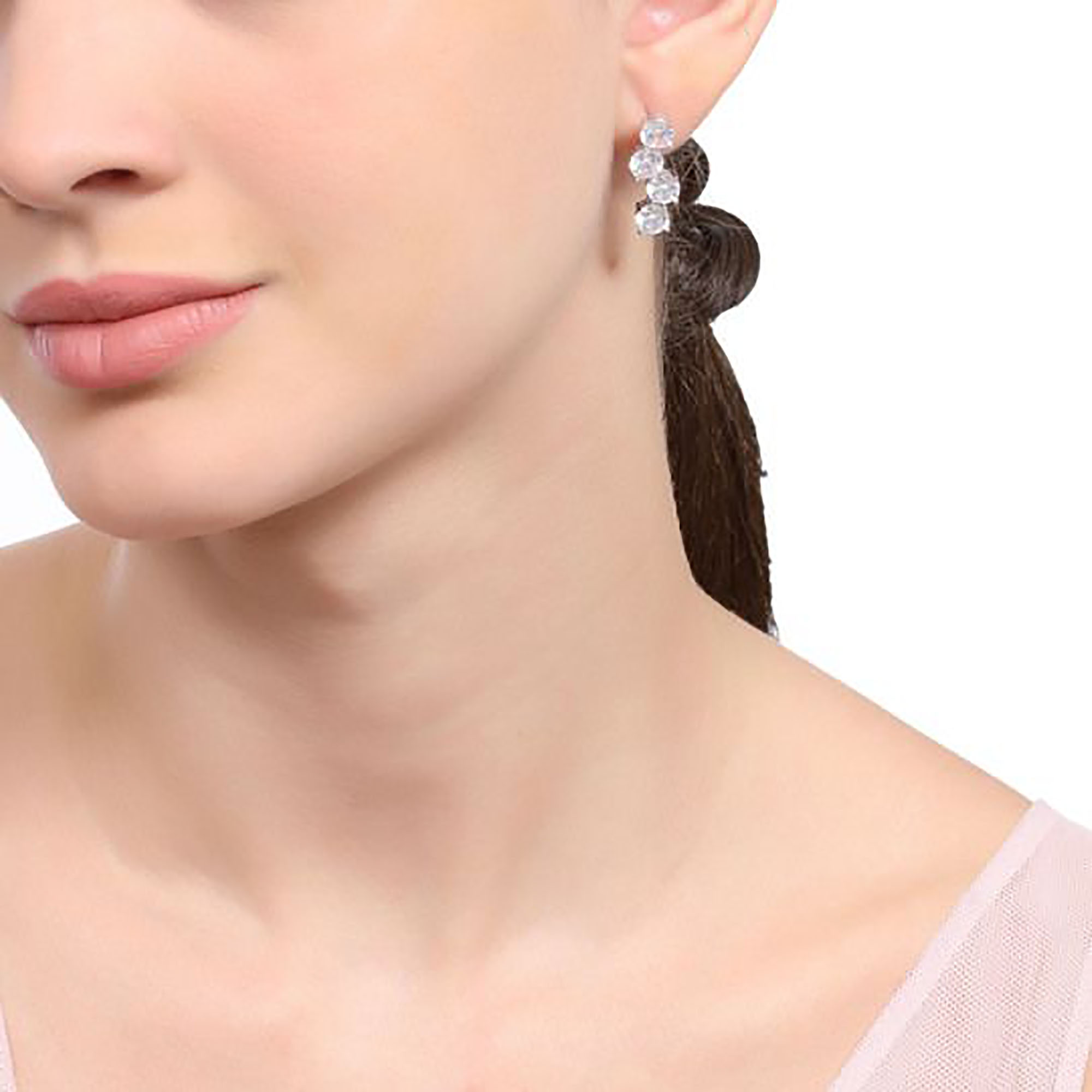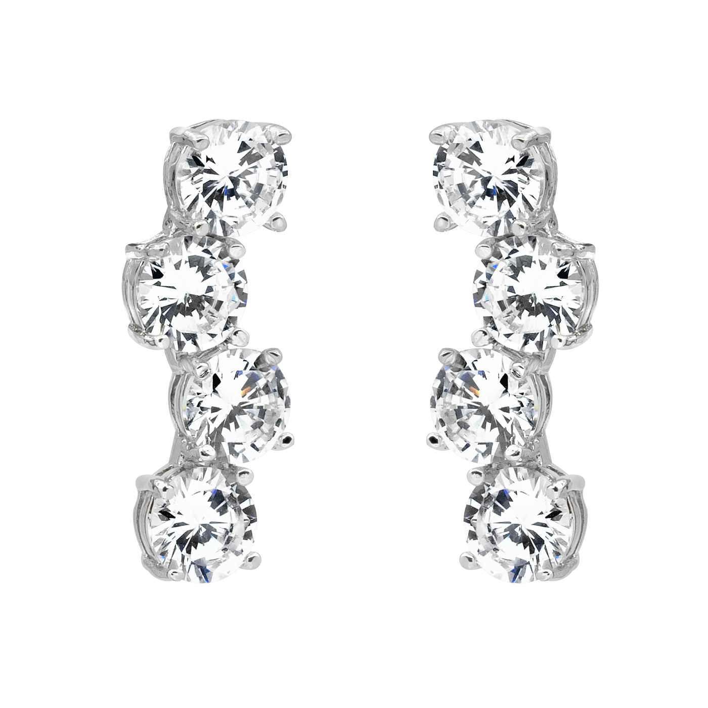 Aretes en baño de oro blanco de 18 quilates, fino diseño con incrustaciones de cristales en color blanco. Fabricado en una estructura de aleación de platino con rodio sin níquel.