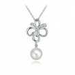 Dije con cadena en baño de oro blanco de 18 quilates, fino diseño de flor estilizada, con perla blanca e incrustaciones de cristales en color blanco. Fabricado en una estructura de aleación de platino con rodio sin níquel.
