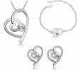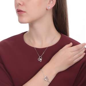 Juego de aretes, dije con cadena y brazalete en baño de oro blanco de 18 quilates , con diseño de corazón estilizado con incrustaciones de cristales en color blanco. Fabricado en una estructura de aleación de platino con rodio sin níquel. Cuenta con una cadena de 40 cm, con extensión de 5 cm.
