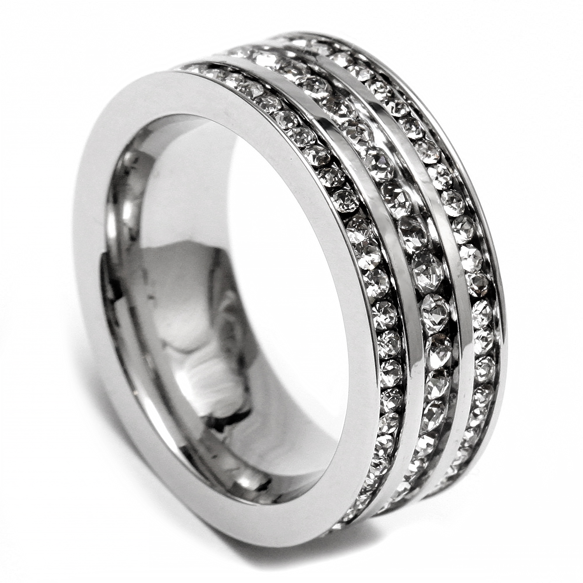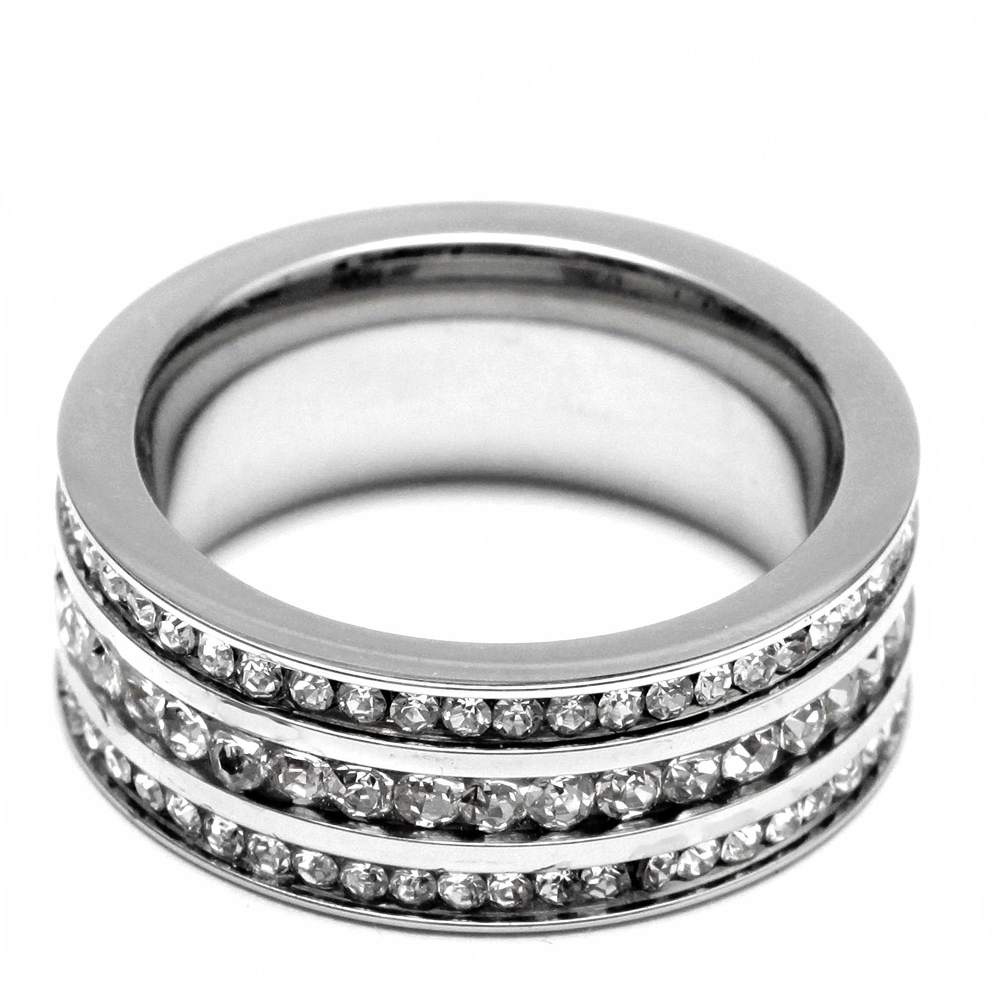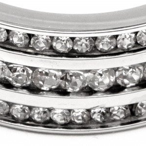 Anillo en baño de oro blanco de 18 quilates, diseño de argolla con triple hilera de cristales blancos.