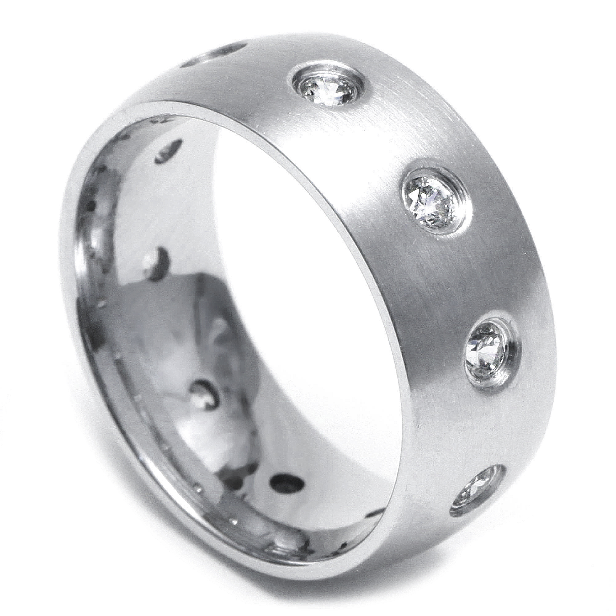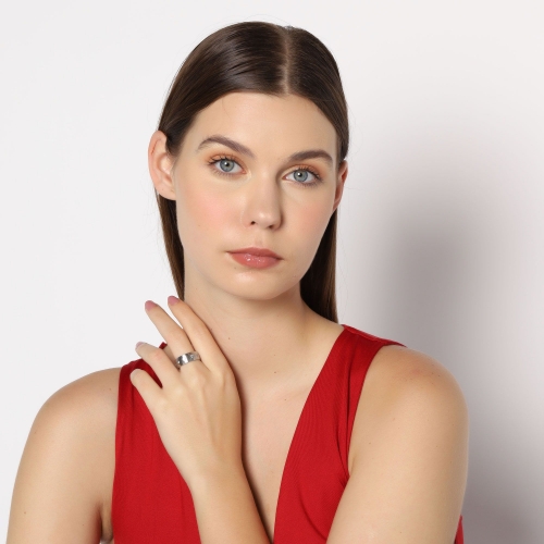 Precioso anillo, en acero inoxidable, acabado alto pulido en tono plata, fino diseño con detalle calado e incrustaciones de cristales blancos.