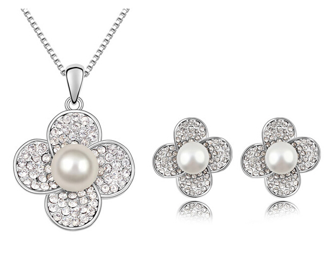 Lindo juego de aretes y dije con cadena en baño de oro blanco de 18 quilates, diseño de flor, perlas blancas e incrustaciones de cristales en color blanco. Fabricado en una estructura de aleación de platino con rodio sin níquel.