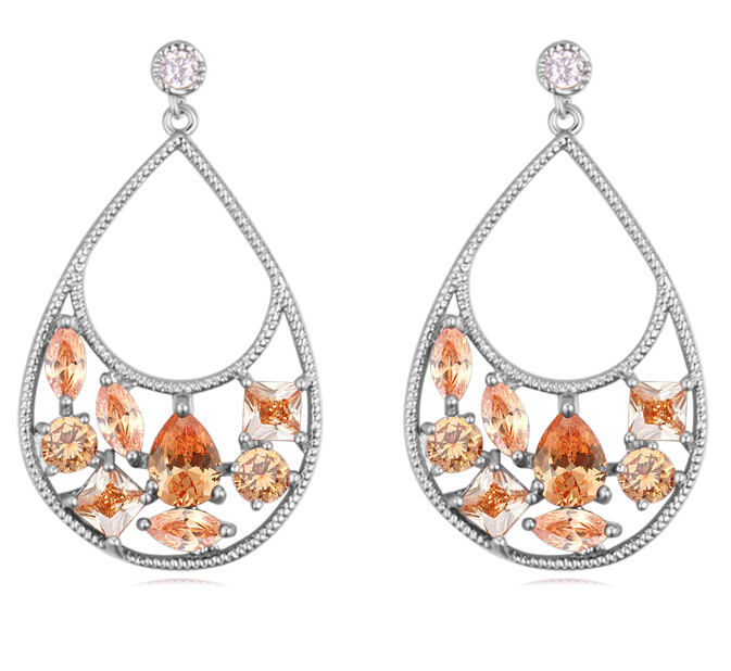 Aretes en baño de oro blanco de 18 quilates, diseño de gota con incrustaciones de cristales en color ámbar. Fabricado en una estructura de aleación de platino con rodio sin níquel.