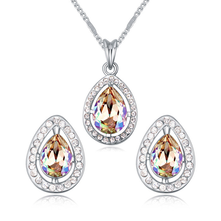 Lindo juego de aretes y dije con cadena en baño de oro blanco de 18 quilates, diseño de gota, con cristales en color ámbar corte pera e incrustaciones de cristales blancos. Fabricado en una estructura de aleación de platino con rodio sin níquel.