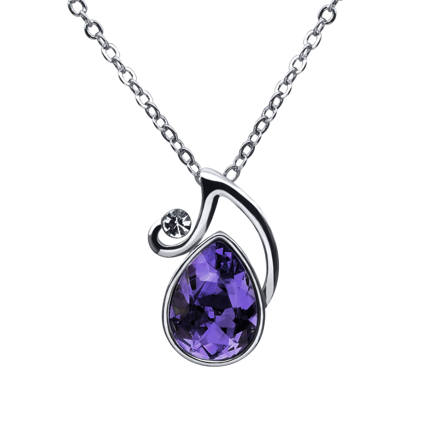 Dije con cadena en baño de oro banco de 18 quilates, diseño de gota con incrustación de cristal en color morado y una chispa de cristal blanco. Fabricado en una estructura de aleación de platino con rodio sin níquel.