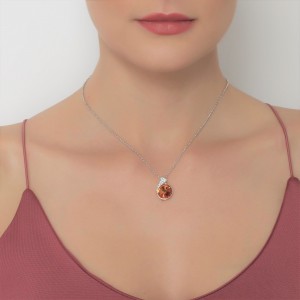 Dije con cadena en baño de oro blanco de 18 quilates, diseño de circulo con incrustaciones de cristales en color blanco y ámbar. Fabricado en una estructura de aleación de platino con rodio sin níquel.