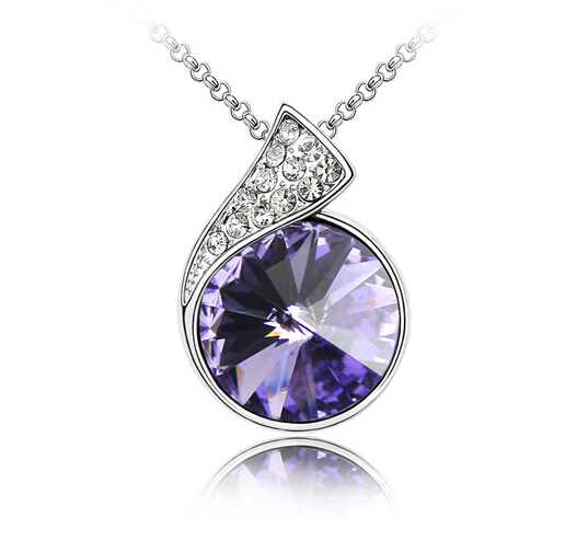 Dije con cadena en baño de oro blanco de 18 quilates, diseño de circulo con incrustaciones de cristales en color blanco y morado. Fabricado en una estructura de aleación de platino con rodio sin níquel.