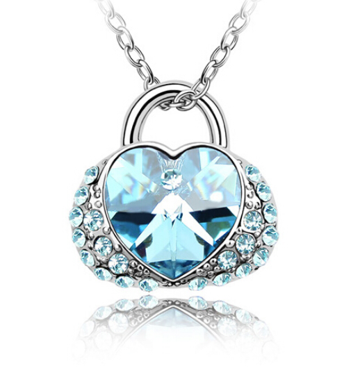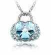 Dije con cadena en baño de oro blanco de 18 quilates, fino diseño de bolsa con cristal azul en forma de corazón e incrustaciones de cristales en color azul y blanco. Fabricado en una estructura de aleación de platino con rodio sin níquel.