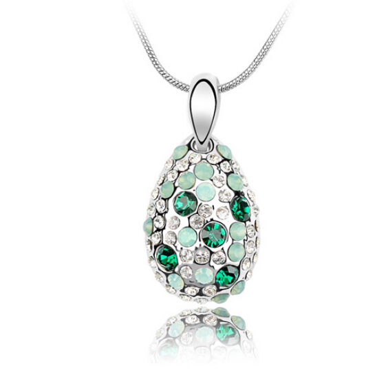 Dije con cadena en baño de oro blanco de 18 quilates, fino diseño de gota con incrustaciones de cristales en color verde, tornasol y blanco. Fabricado en una estructura de aleación de platino con rodio sin níquel.
