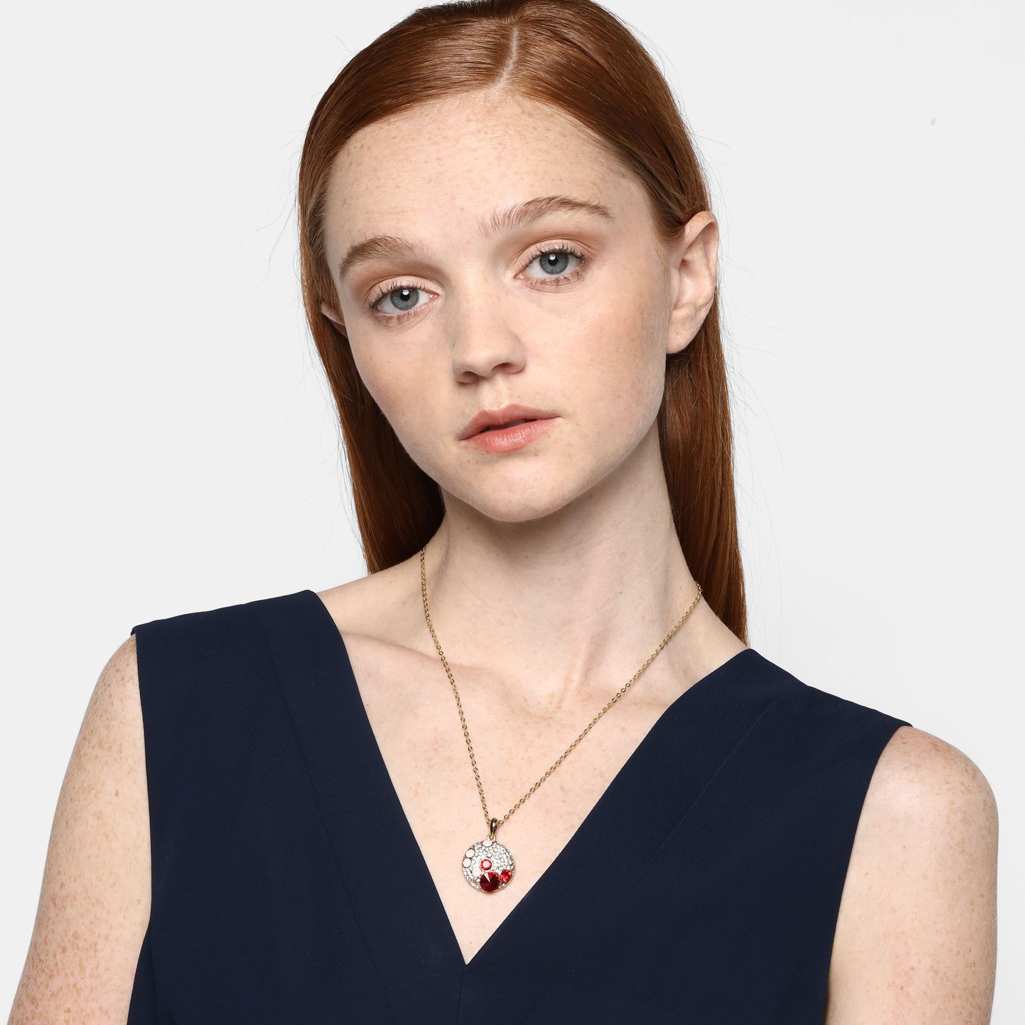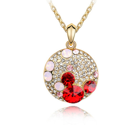 Dije con cadena en baño de oro amarillo de 18 quilates, fino diseño de círculo con incrustaciones de cristales en color rojo, tornasol y blanco. Fabricado en una estructura de aleación de platino con rodio sin níquel.