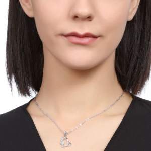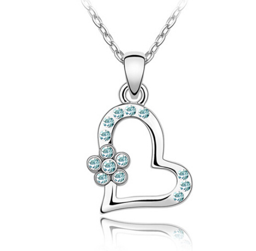 Femenino dije con cadena, en baño de oro blanco de 18 quilates, diseño de corazón, detalle de flor e incrustaciones de cristales color azul. Fabricado en una estructura de aleación de platino con rodio sin níquel.
