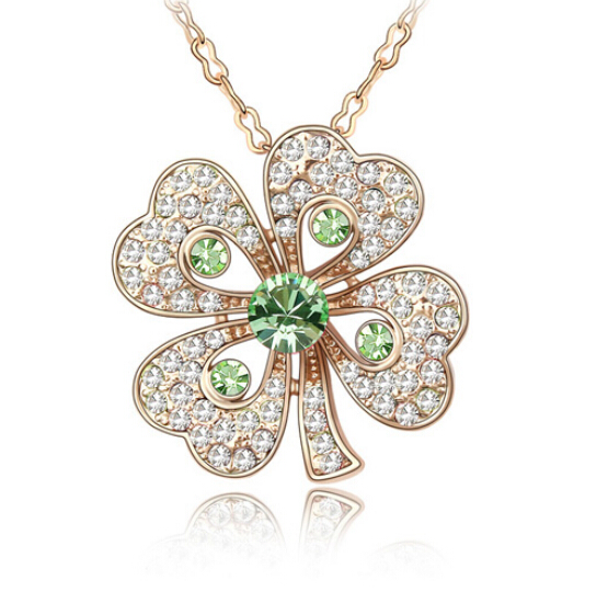 Dije con cadena en baño de oro rosa de 18 quilates, diseño de trébol, con cristal verde corte brillante e incrustaciones de cristales en color menta y blanco. Fabricado en una estructura de aleación de platino con rodio sin níquel.