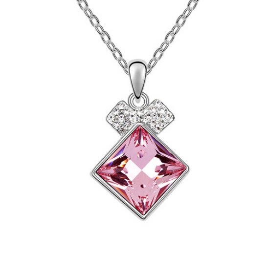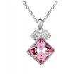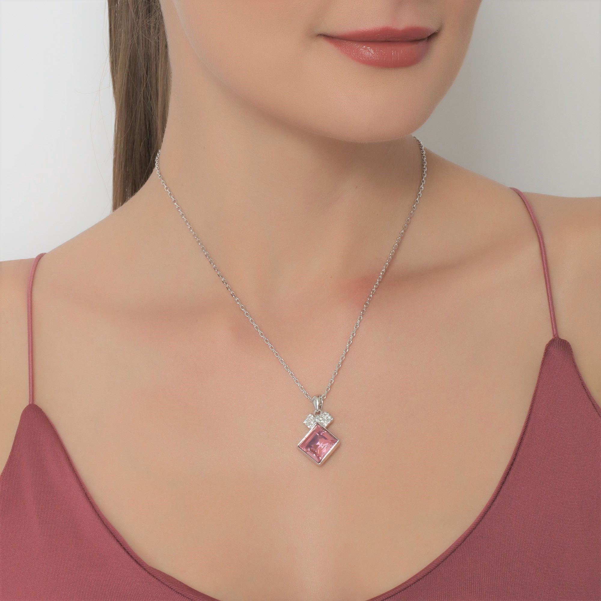 Dije con cadena, en baño de oro blanco de 18 quilates, fino diseño de rombo, con cristal rosa e incrustaciones de cristales en color blanco. Fabricado en una estructura de aleación de platino con rodio sin níquel.