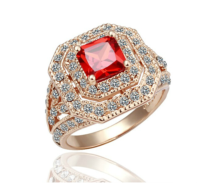 Delicado anillo en baño de oro rosa de 18 quilates, diseño exagonal, con cristal rojo corte princesa e incrustaciones de cristales blancos. Fabricado en una estructura de aleación de platino con rodio sin níquel.