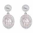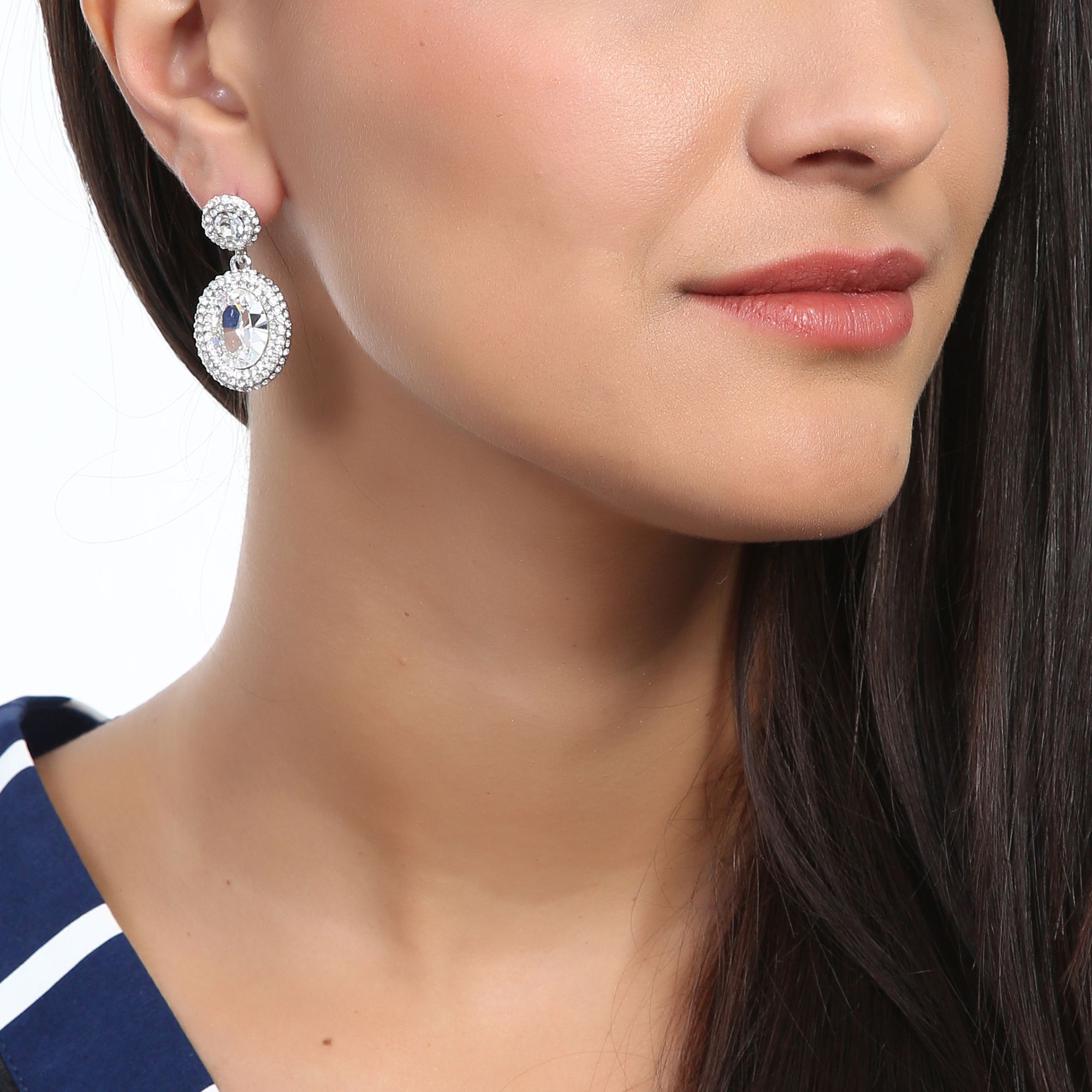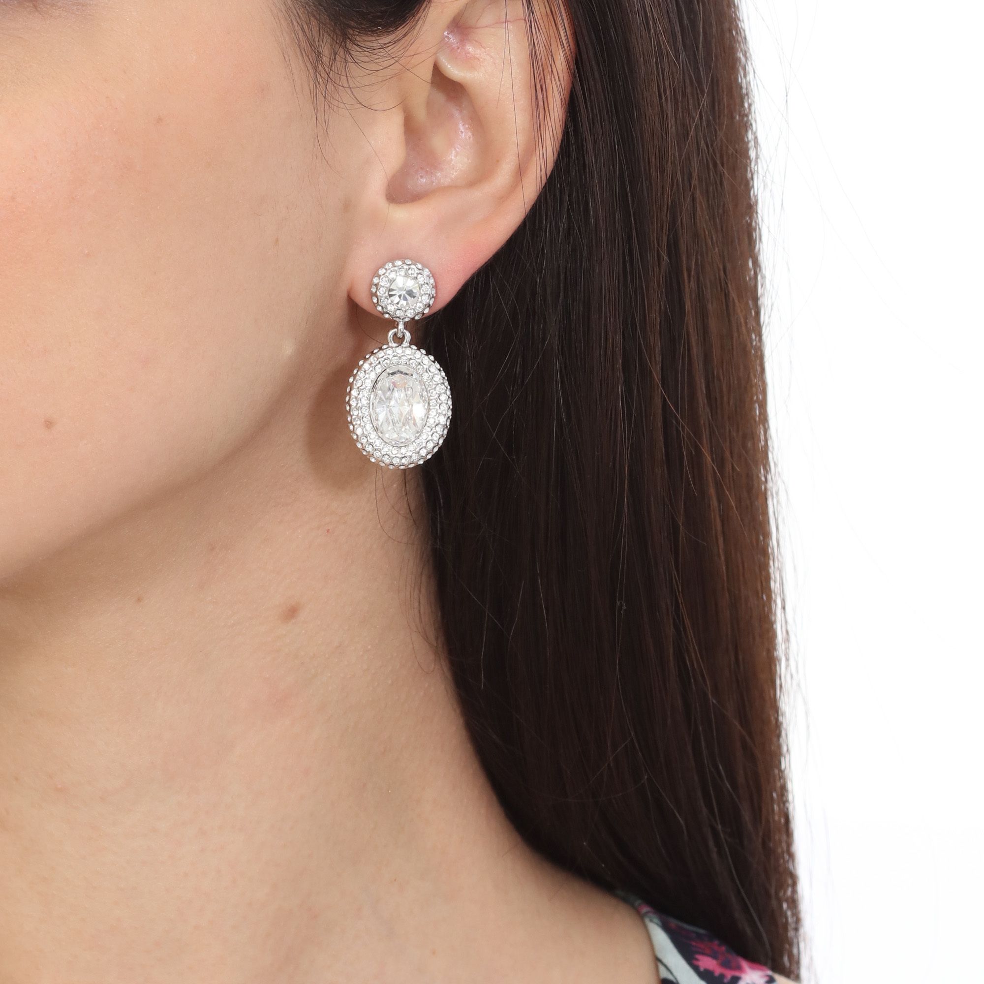 Hermosos aretes en baño de oro blanco de 18 quilates, con cristal blanco corte oval, cristal blanco corte brillante e incrustaciones de cristales en color blanco. Fabricado en una estructura de aleación de platino con rodio sin níquel.