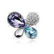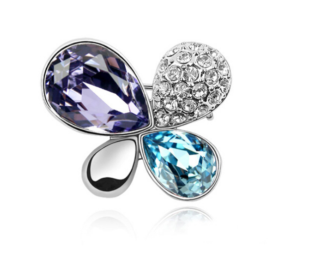 Lindo prendedor, en baño de oro blanco de 18 quilates, fino diseño de flor, con cristales en morado y azul corte pera, detalle en plateado acabado brillante e incrustaciones de cristales blancos. Fabricado en una estructura de aleación de platino con rodio sin níquel.