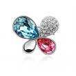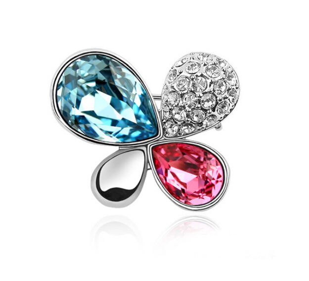 Lindo prendedor, en baño de oro blanco de 18 quilates, fino diseño de flor, con cristales rosa y azul corte pera, detalle plateado en acabado brillante e incrustaciones de cristales blancos. Fabricado en una estructura de aleación de platino con rodio sin níquel.