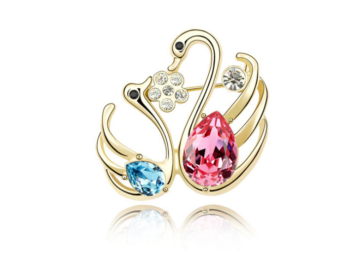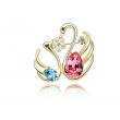 Prendedor en baño de oro amarillo de 18 quilates, diseño de cisnes, con cristales en color azul y rosa corte pera, flor blanca e inscrustaciones de cristales blancos y negros. Fabricado en una estructura de aleación de platino con rodio sin níquel.