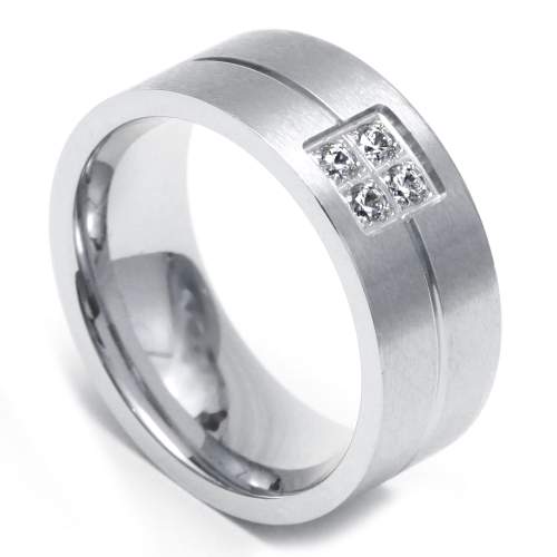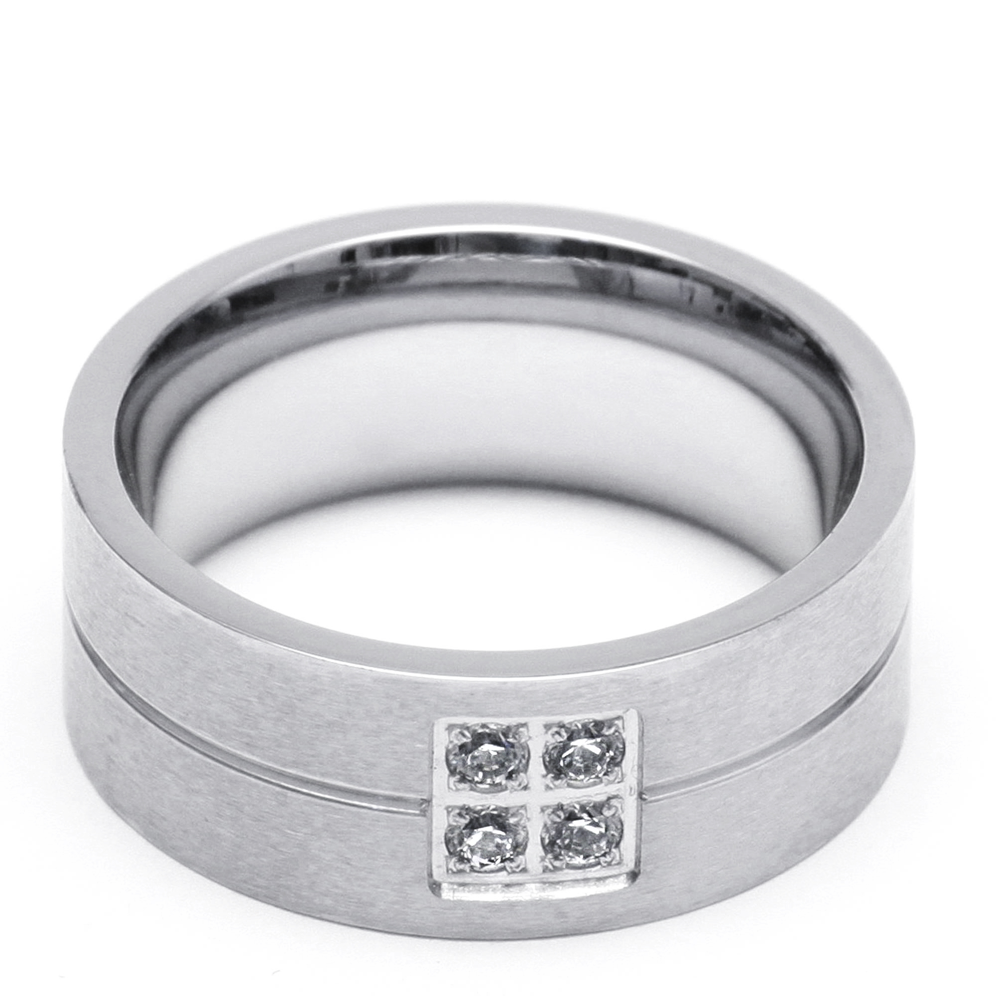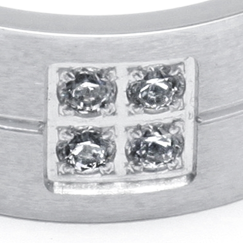 Precioso anillo, en acero inoxidable, acabado alto pulido en tono plata, fino diseño con detalle calado e incrustaciones de cristales blancos.