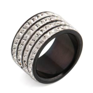 Precioso anillo, en acero inoxidable, acabado alto pulido en tono plata, fino diseño con detalle calado e incrustaciones de cristales blancos.