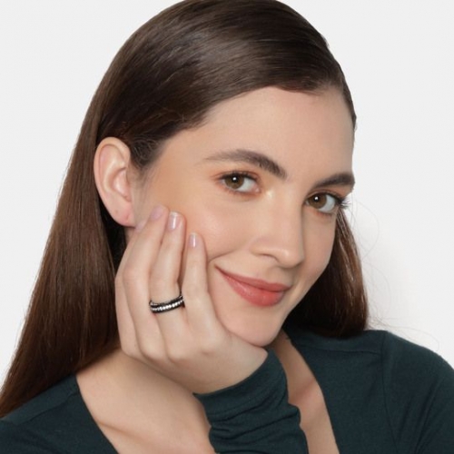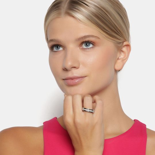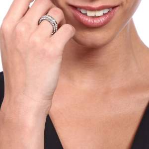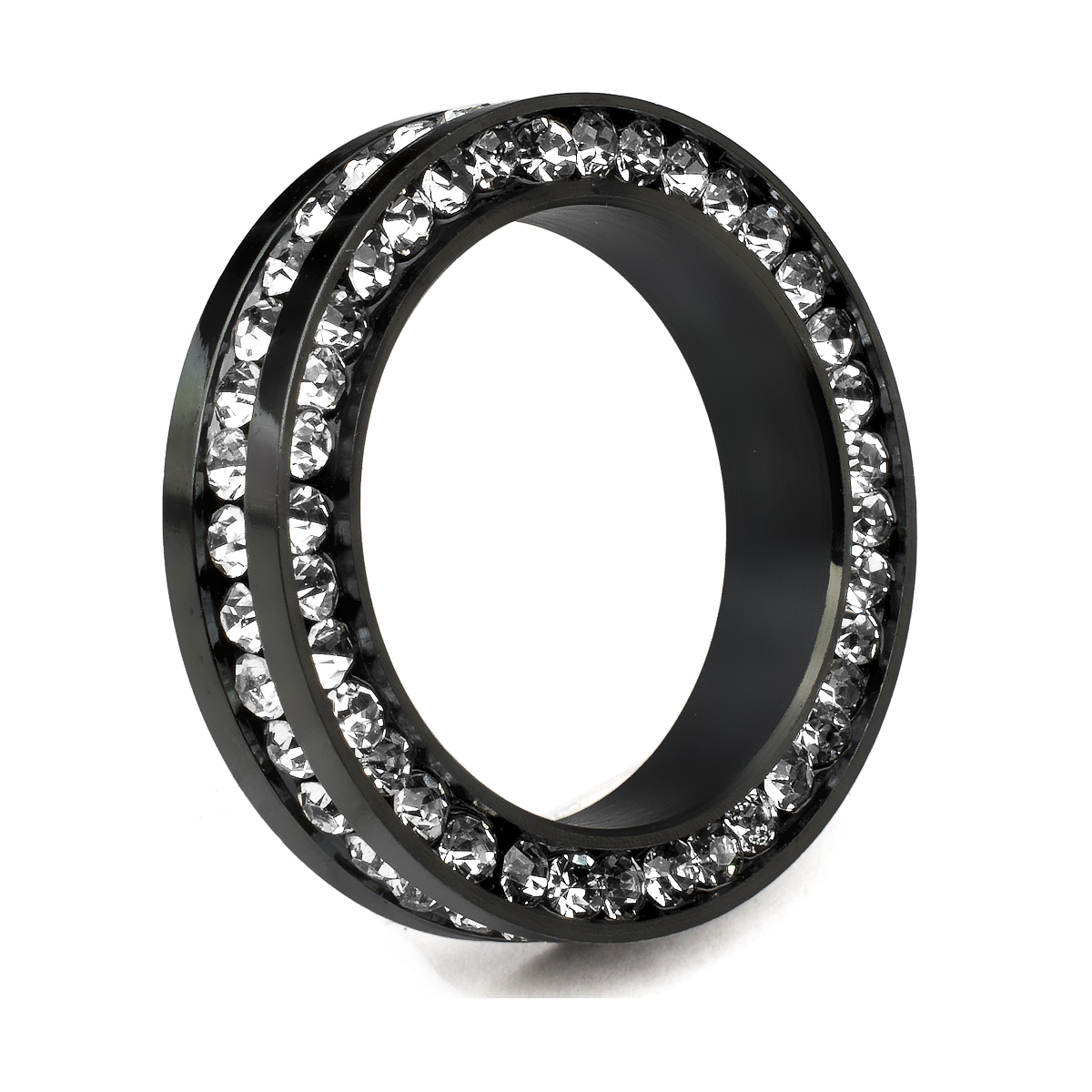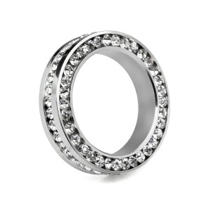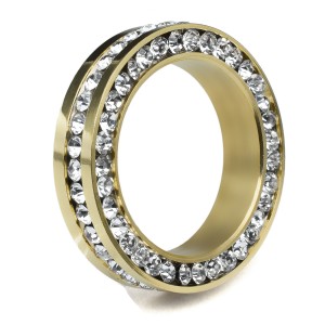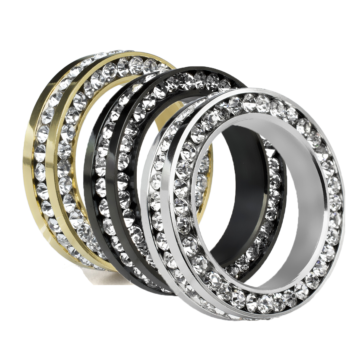 Hermoso juego de anillos en acero inoxidable, en acabado blanco, amarillo y negro, fino diseño con incrustaciones de cristales en color blanco.