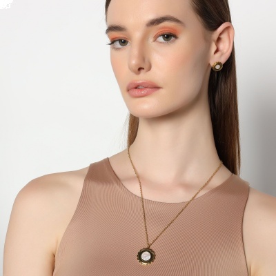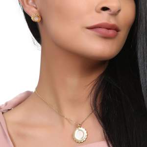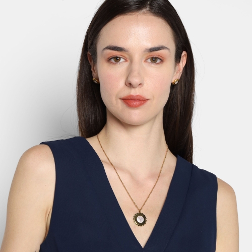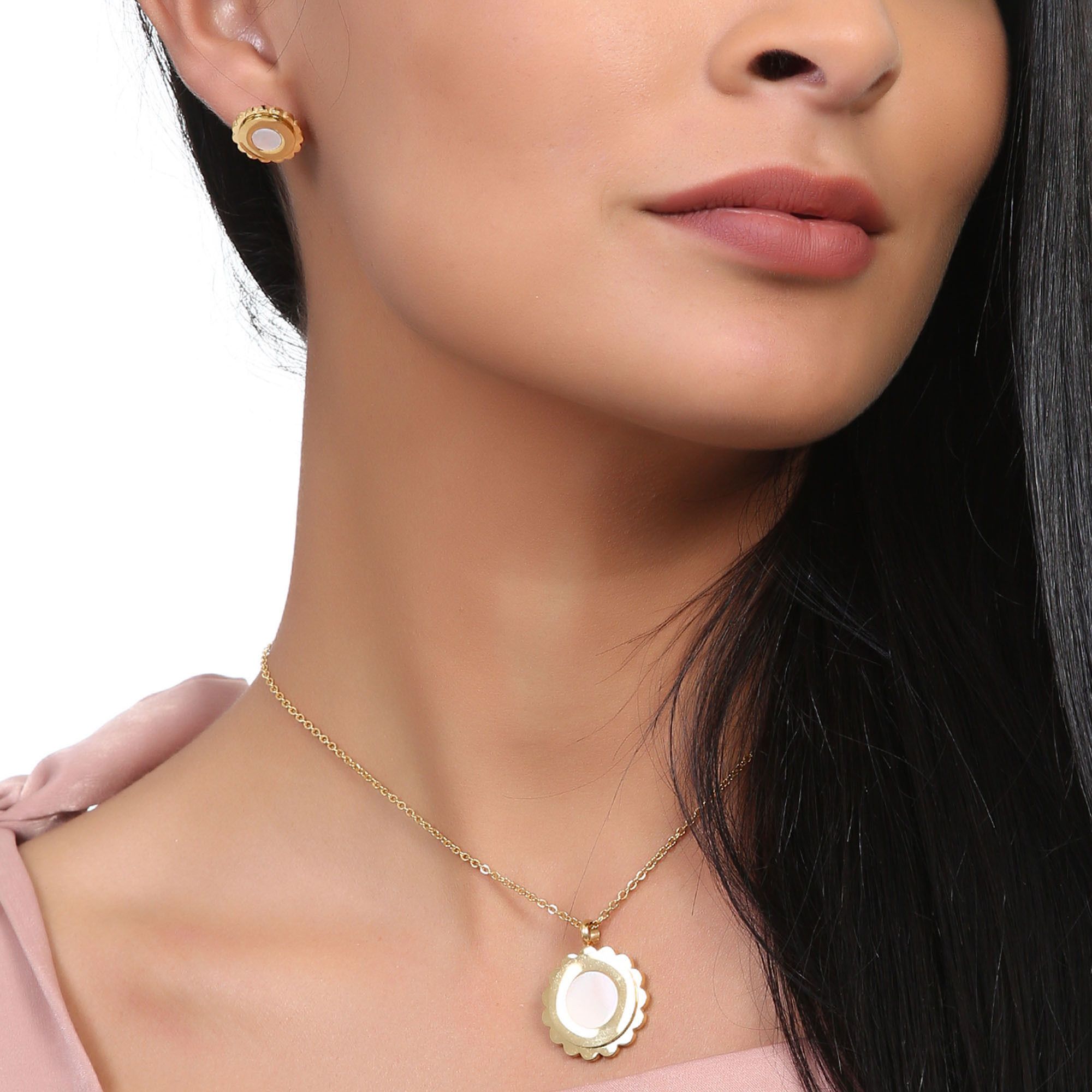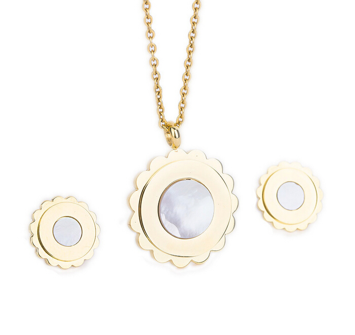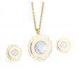 Juego de aretes y dije con cadena en acero inoxidable amarillo, dise�o de flores con incrustaci�n de madre perla.