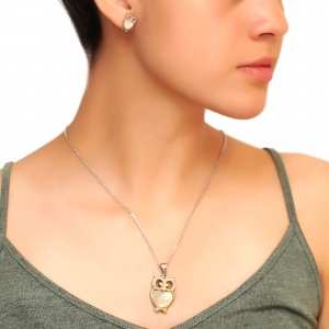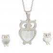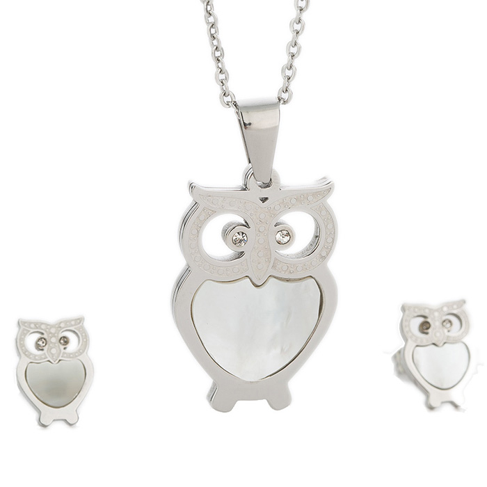 Juego de aretes y dije con cadena en acero inoxidable, diseño de búho, con aplicación de madre perla e incrustaciones de cristales blancos.