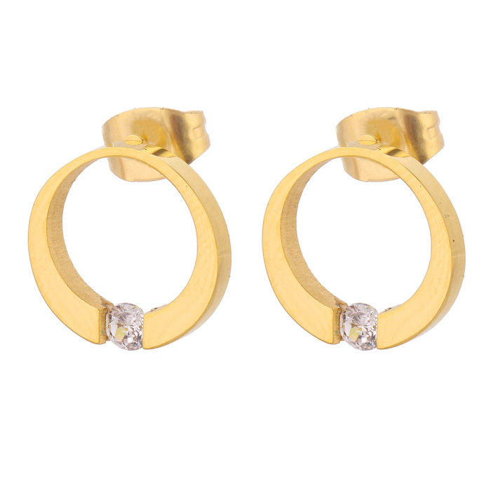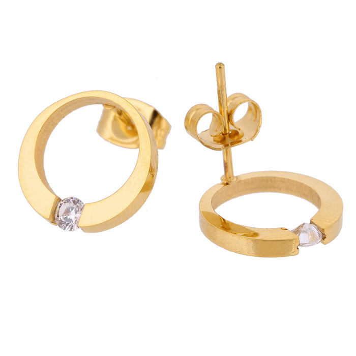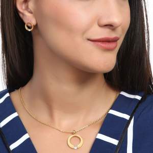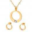 Juego de aretes y dije con cadena en acero inoxidable amarillo, diseño de aros con cristales en color blanco corte brillante.