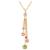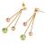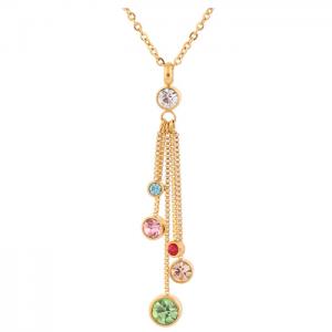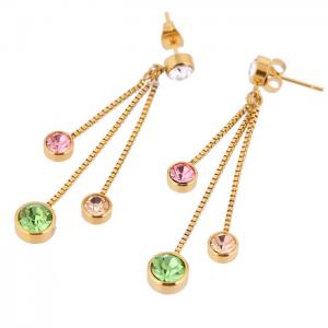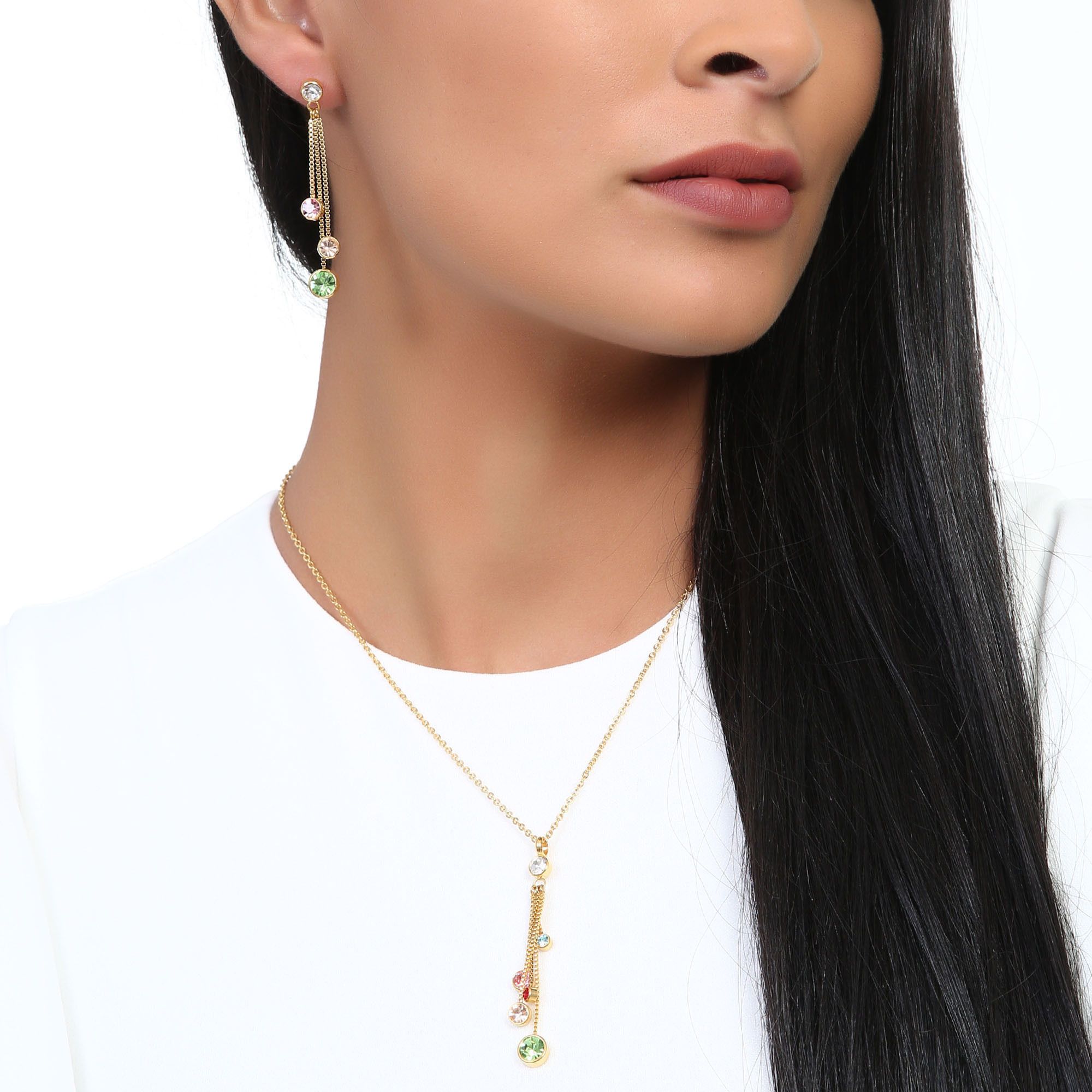 Juego de aretes y dije con cadena en baño de oro amarillo de 18 quilates , diseño de cascada con incrustaciones de cristales en color blanco, azul, rojo, rosa y verde. Fabricado en una estructura de aleación de platino con rodio sin níquel.