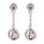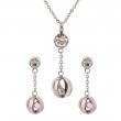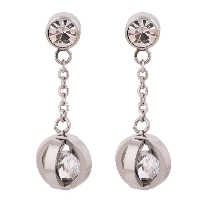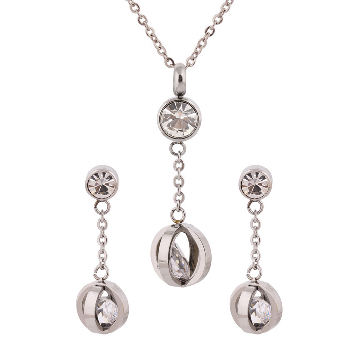 Juego de aretes y dije con cadena enacero inoxidable color blanco de 18 quilates , diseño de esferas con incrustaciones de cristales en color blanco.
