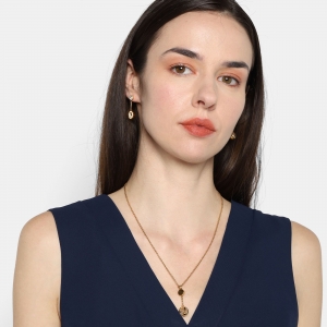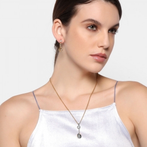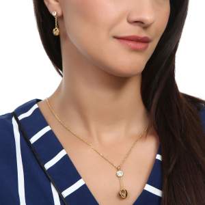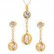 Juego de aretes y dije con cadena en acero inoxidable amarillo, dise�o de esferas con incrustaciones de cristales en color blanco.