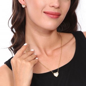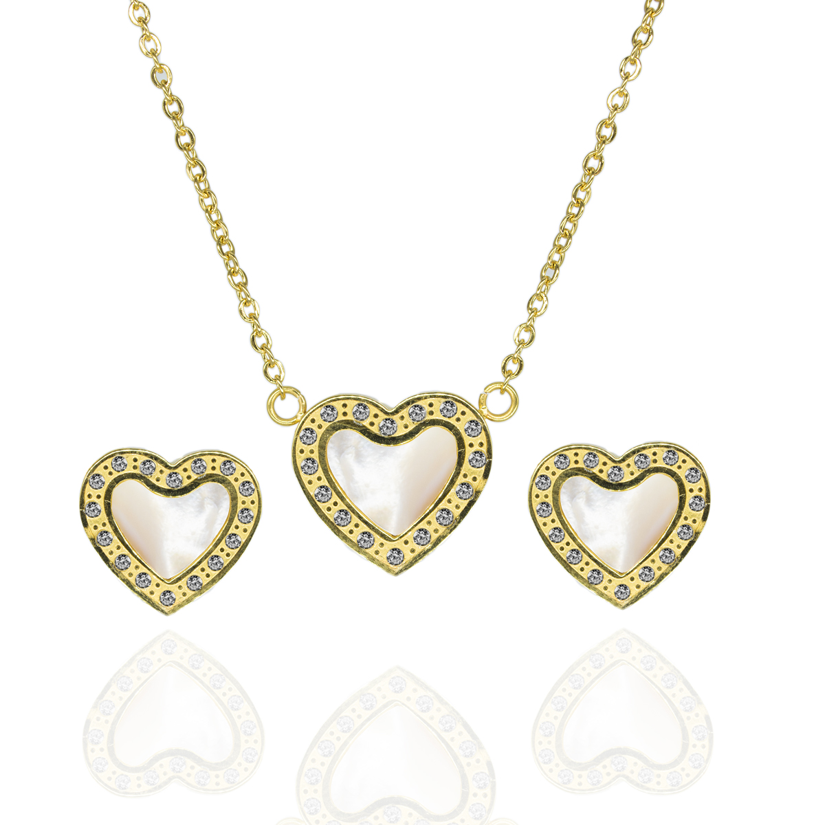 Hermoso juego de acero inoxidable color amarillo, diseño de corazón, con aplicación de madre perla e incrustaciones de cristal blanco.