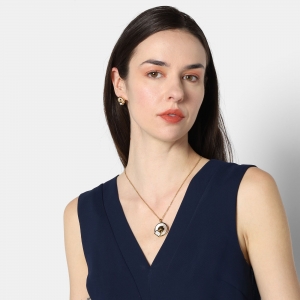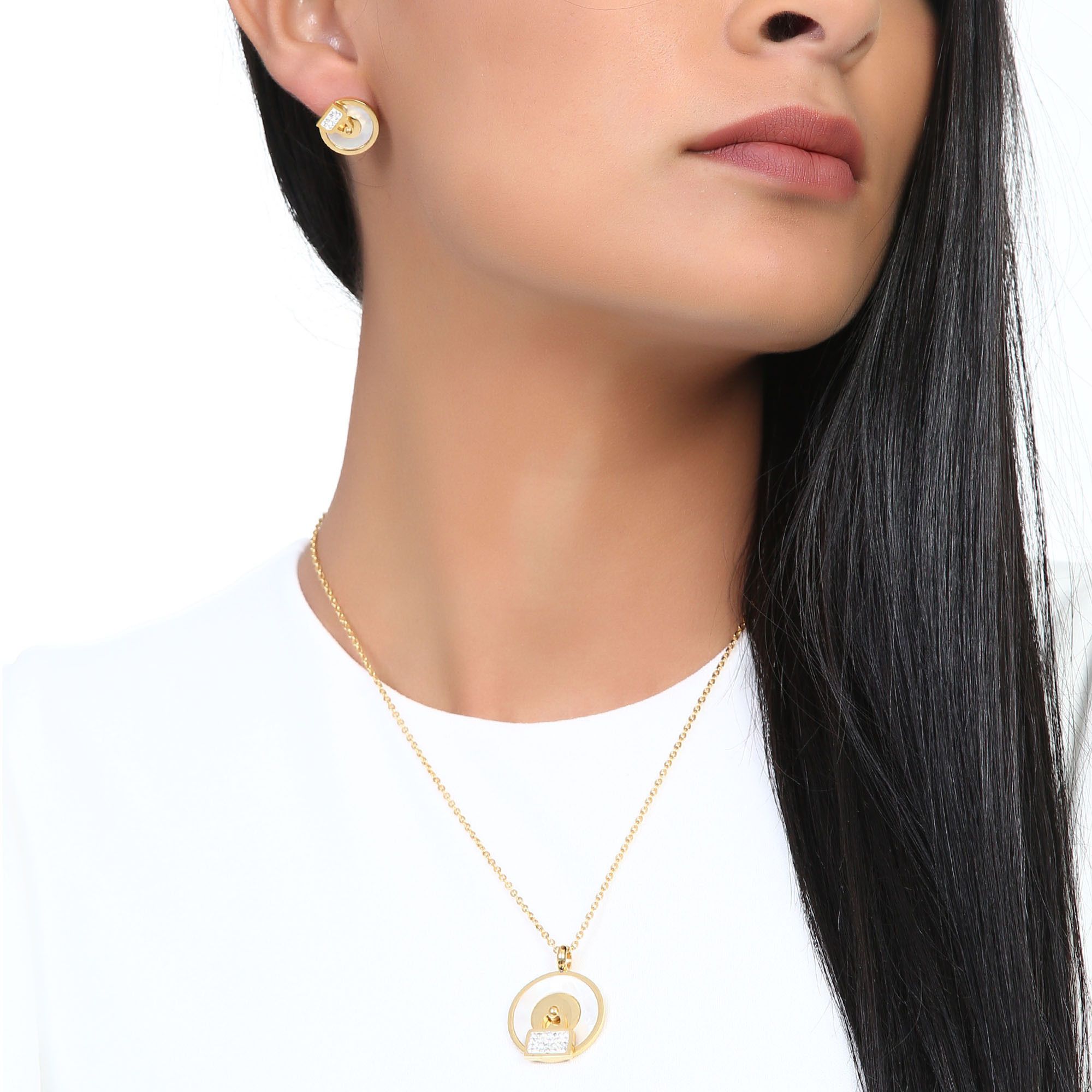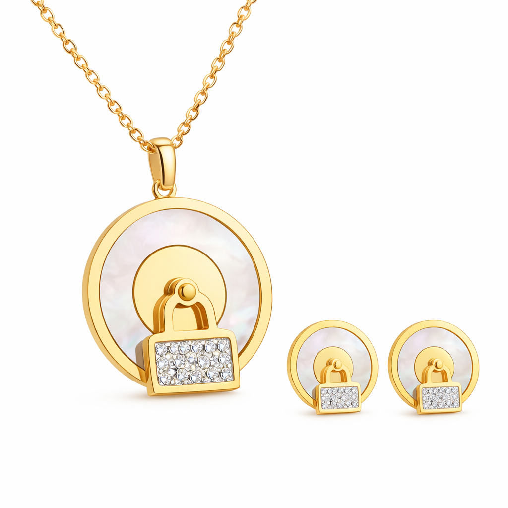 Juego de aretes y dije con cadena en ba�o de oro amarillo de 18 quilates , dise�o de candado, con aplicaci�n de madre perla e incrustaciones de cristales blancos.