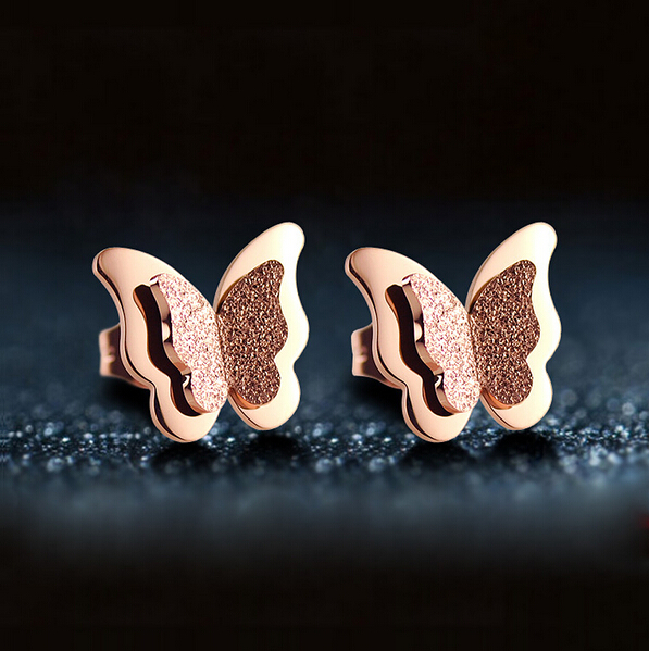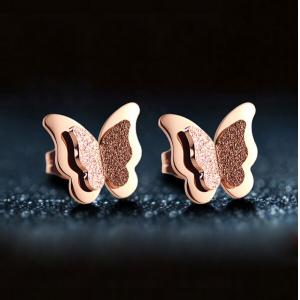Juego de aretes y dije en acero inoxidable color rosa, diseño de mariposa en relieve con acabado esmerilado e incrustaciones de cristales blancos.