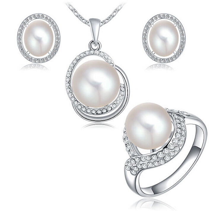 Juego de aretes, anillo y dije con cadena en baño de oro blanco de 18 quilates , diseño de curvas, detalle de perla blanca e incrustaciones de cristales en color blanco. Fabricado en una estructura de aleación de platino con rodio sin níquel.