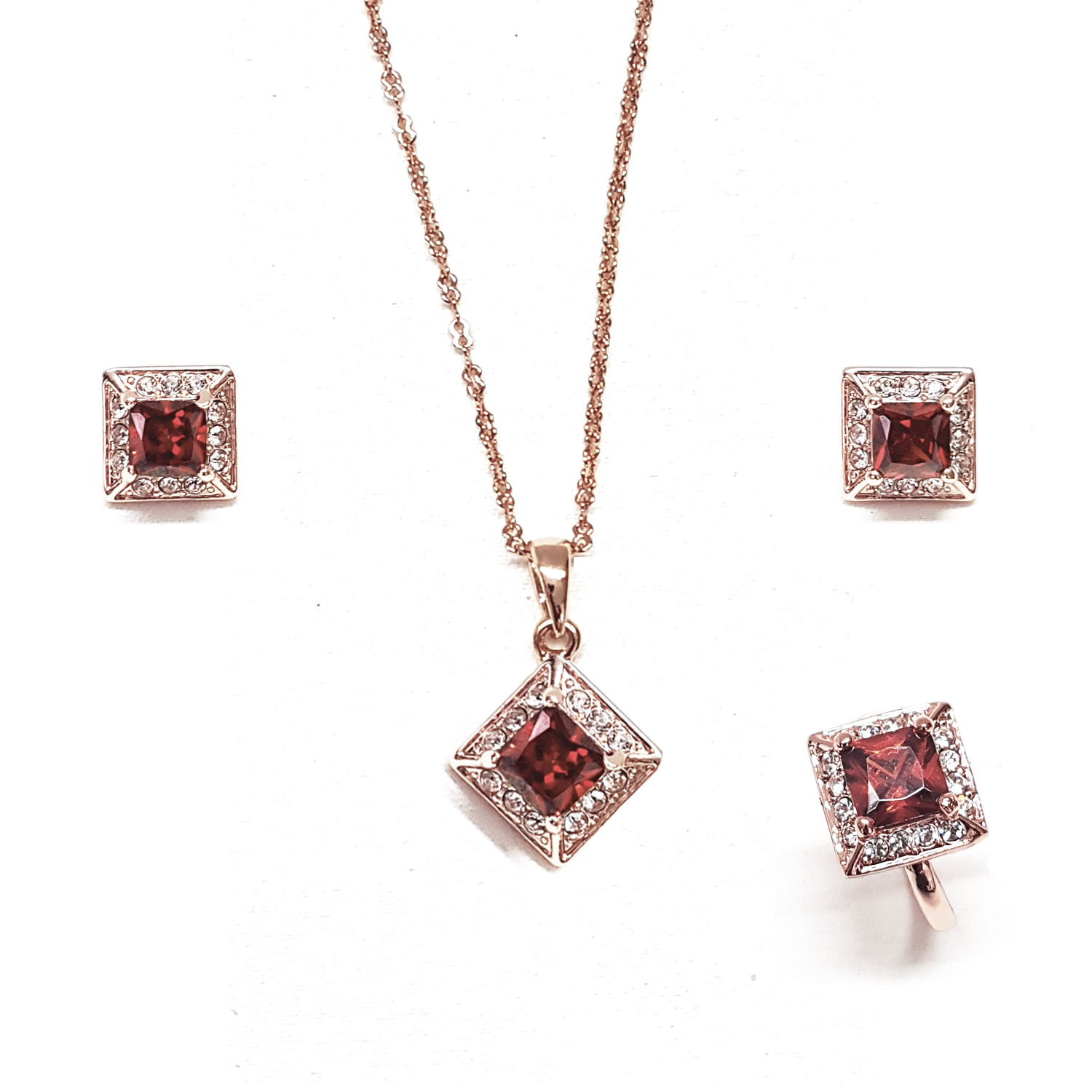 Hermoso y elegante juego de aretes, anillo y dije con cadena en baño de oro rosa de 18 quilates, diseño de rombo, con cristales vino corte princesa e incrustaciones de cristales blancos. Fabricado en una estructura de aleación de platino con rodio sin níquel.