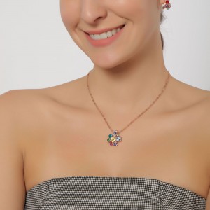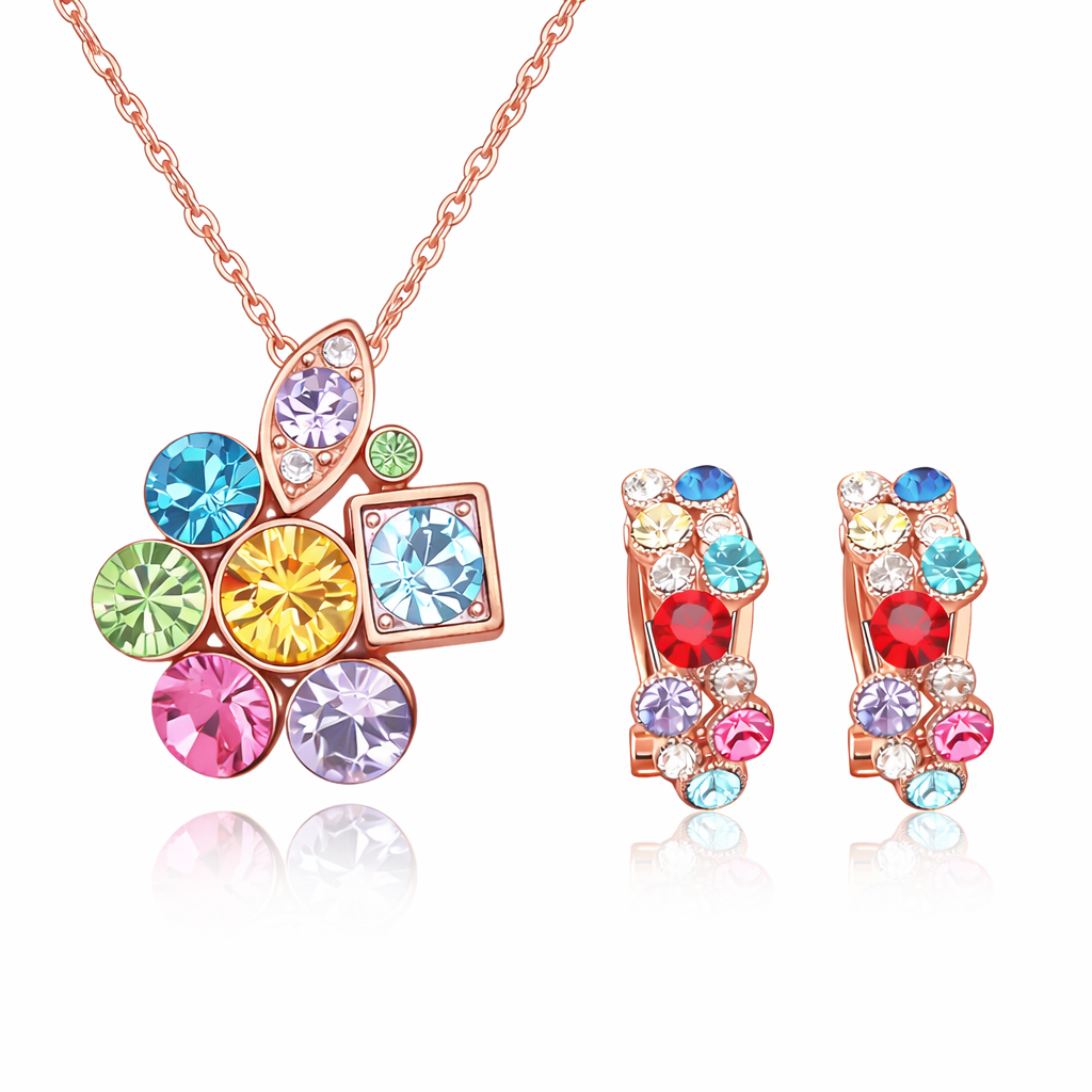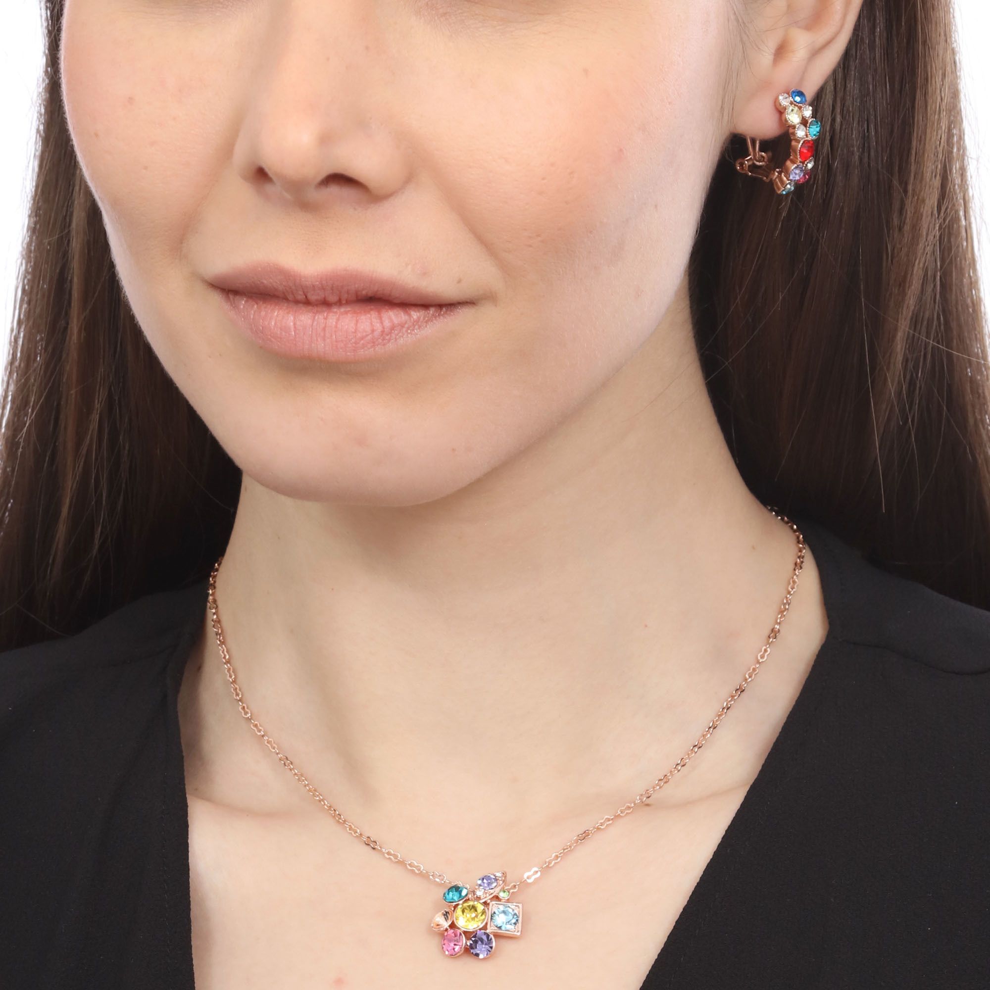Juego de aretes y dije con cadena en baño de oro rosa de 18 quilates , diseño de flor, con hoja dorada e incrustaciones de cristales en colores y blancos. Fabricado en una estructura de aleación de platino con rodio sin níquel.