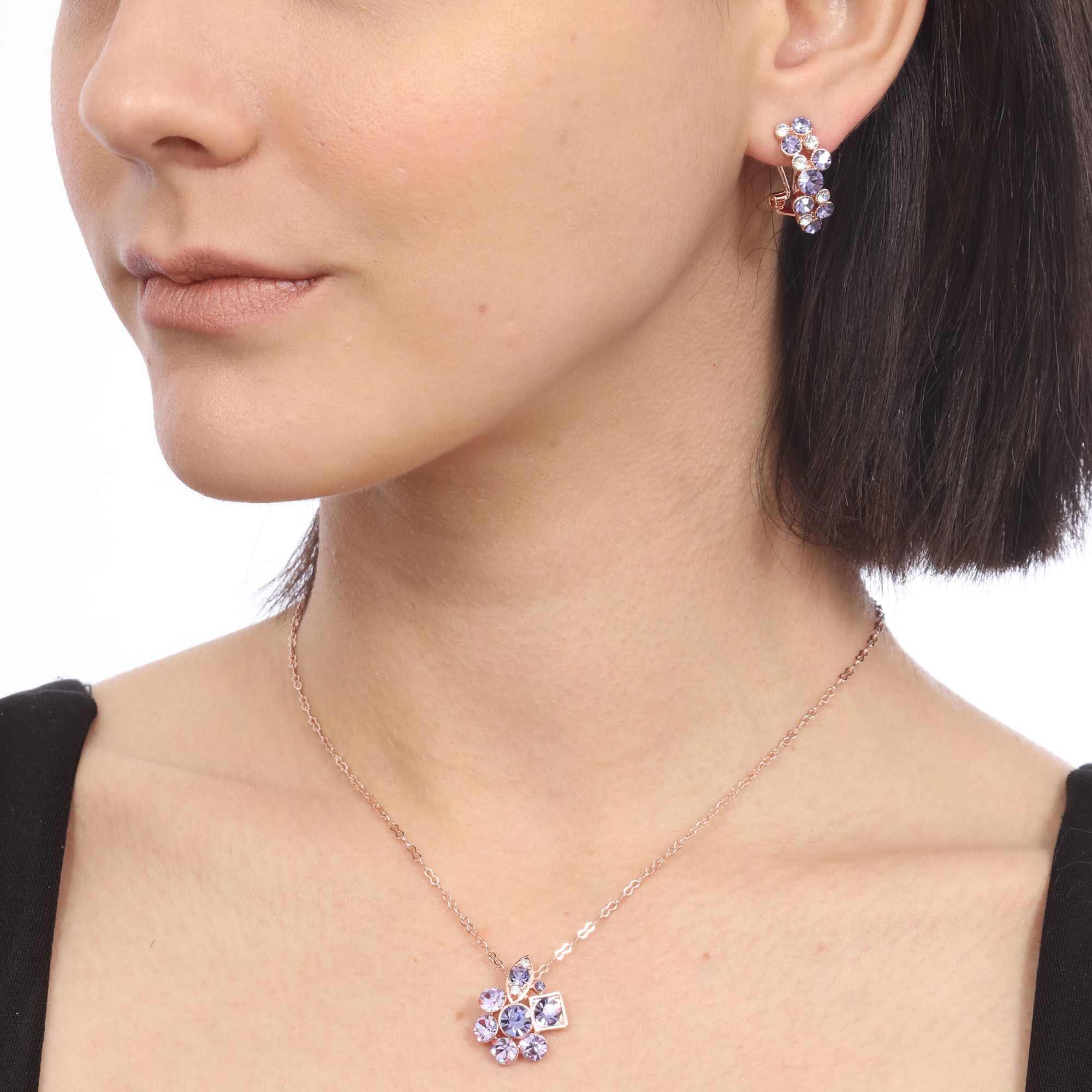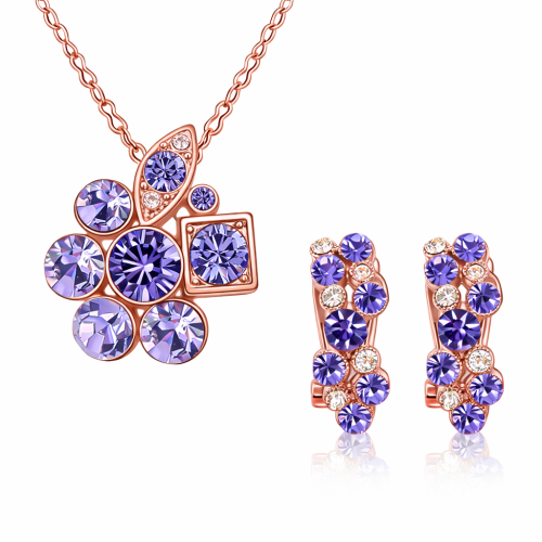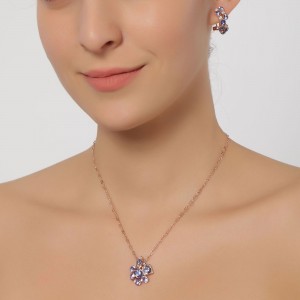 Juego de aretes y dije con cadena en baño de oro rosa de 18 quilates , diseño de flor con hoja dorada e incrustaciones de cristales en tonos morados.