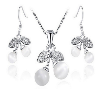 Juego de aretes y dije en baño de oro blanco de 18 quilates , diseño de cerezas, con perlas beige y blanco e incrustaciones de cristales en color blanco. Fabricado en una estructura de aleación de platino con rodio sin níquel.