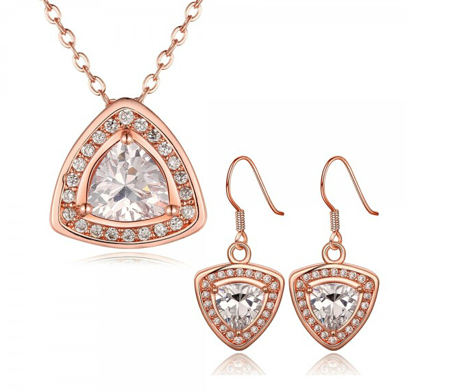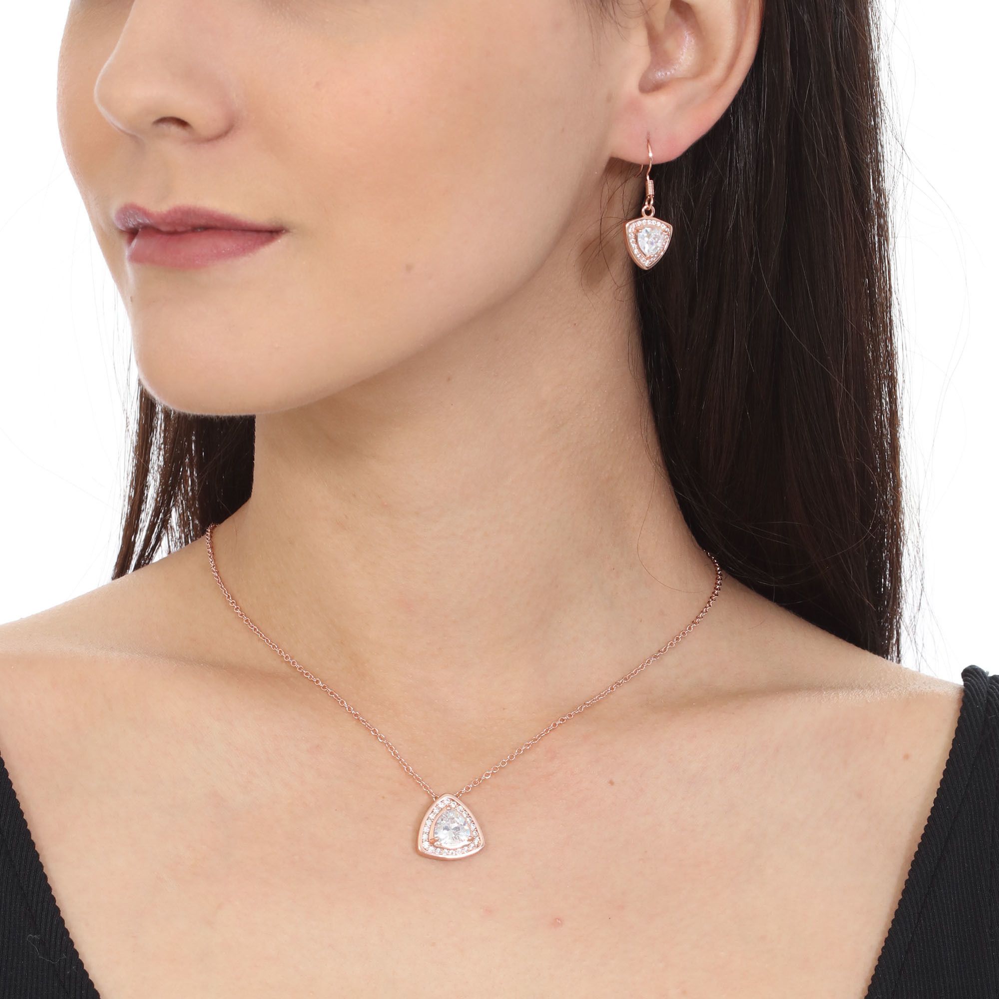 Hermoso juego de aretes y dije con cadena en baño de oro rosa de 18 quilates , diseño de triángulo con cristales blancos corte trillion e incrustaciones de cristales color blanco. Fabricado en una estructura de aleación de platino con rodio sin níquel.